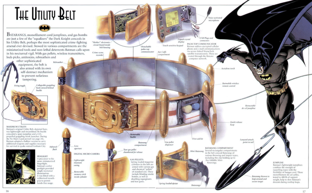 المركبات: مثل Batmobile، Batplane، ووسائل متعددة للقتال والنقل.