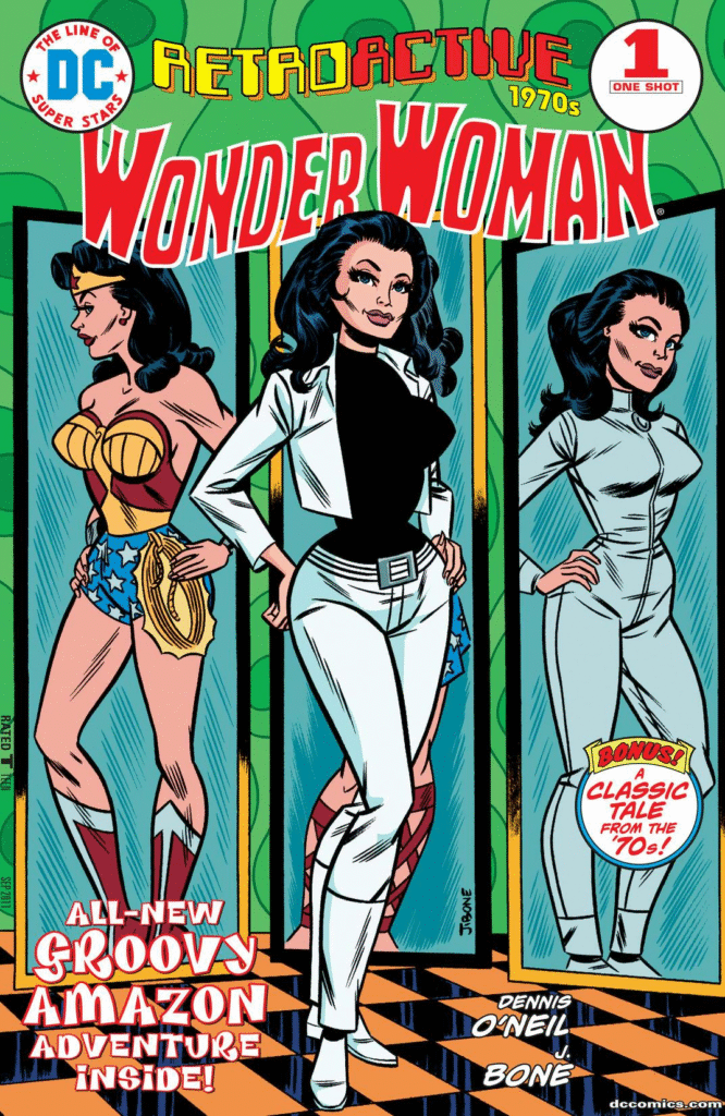 العصر الفضي والسبعينيات: في أوائل الستينيات، أصبحت وندر وومان عضوًا مؤسسًا في فريق فرقة العدالة الجديد، مما رسّخ مكانتها ضمن نخبة أبطال دي سي. لكن أواخر الستينيات شهدت تغييرًا جذريًا للشخصية؛ حيث فقدت ديانا قواها مؤقتًا وتخلّت عن زيها التقليدي. في تلك الفترة (1968–1972) عاشت ديانا مغامراتها كإنسانة عادية تعتمد على مهارات القتال فقط وظهرت بملابس مدنية عصرية بدلاً من لباسها الشهير، وذلك في محاولة لمواكبة موجة القصص البوليسية والجاسوسية آنذاك. قوبل هذا التغيير بانتقادات شديدة من المعجبين والنسويات اللواتي رأين فيه تراجعًا عن رمزية قوة المرأة. وبحلول عام 1973 عادت وندر وومان إلى سابق عهدها بقواها الخارقة وزيها المعروف، حتى أنها تصدّرت غلاف مجلة Ms. النسوية في عام 1972 كرمز لتحرير المرأة واستعادة مجدها البطولي.