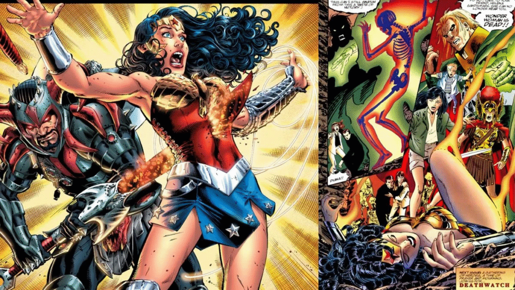 Crisis on Infinite Earths (1985): الحدث الضخم الذي أنهى الحقبة القديمة لشخصية وندر وومان ضمن عالم دي سي. في ختام هذه السلسلة، تعرضت ديانا لقوة كونية أعادتها إلى أصلها الطيني، ما أدى إلى محو قصتها مؤقتًا وفتح الباب لإعادة انطلاقتها من جديد في استمرارية محدثة.