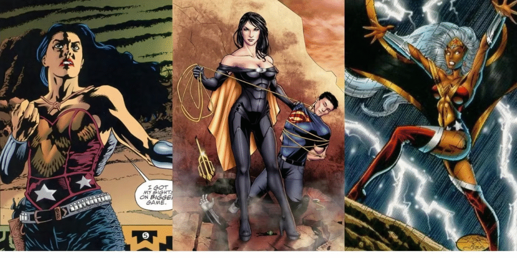 شخصيات بديلة حملت لقب وندر وومان: عبر بعض القصص والاحتمالات المستقبلية، جسدت شخصيات أخرى دور وندر وومان في غياب ديانا أو في أكوان بديلة. على سبيل المثال، في استمرارية ما بعد أزمة 1985 تبيّن أن والدتها الملكة هيبوليتا سافرت عبر الزمن لتصبح هي وندر وومان خلال حقبة الحرب العالمية الثانية، وذلك لسد الفجوة التي خلفها غياب ديانا عن تلك الفترة في الخط الزمني الجديد. كذلك شخصية آرتيميس التي ذكرناها مثّلت “وندر وومان” بديلة لفترة وجيزة في التسعينيات. وفي السبعينيات، قدّمت القصص شخصية نوبيّا – وهي محاربة أمازونية سوداء البشرة – كأخت توأم مفقودة لديانا، ووصفت أحيانًا بأنها نظيرة لديانا في القوة وتحمل لقب المرأة المعجزة في بعض الروايات. بالإضافة إلى ذلك، وفرت قصص Elseworlds والاكوان الموازية تصورات مختلفة تمامًا؛ مثل قصة تتخيل وندر وومان في العصر الفيكتوري (قصة “Amazonia”) أو عوالم مستقبلية تحيد فيها الشخصية عن مسارها المعتاد. كل هذه النسخ البديلة أظهرت مرونة أسطورة وندر وومان وإمكانية إعادة ابتكارها بطرق متجددة مع الحفاظ على جوهرها الإنساني.